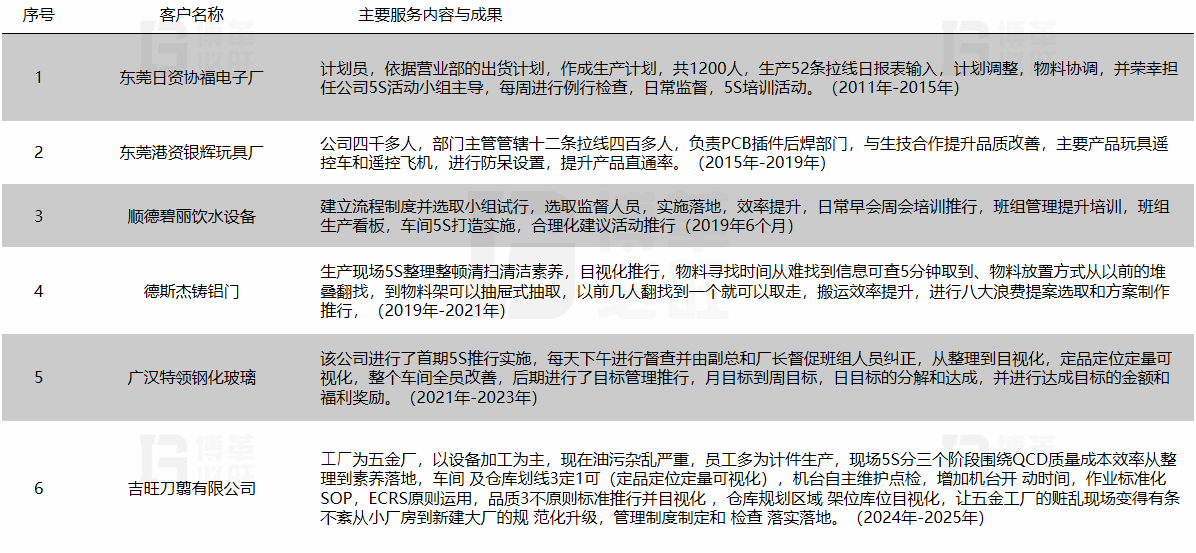 曾任東莞協(xié)福電子廠供應(yīng)鏈計劃部長職位;5S管理活動小組組長。多運用ECRS,PDCA,八大浪費,5W2H進行改善。基本的組織架構(gòu),崗位職責(zé),人事管理等,公司的生產(chǎn)活動從物料采購到產(chǎn)品出貨這個流程,研發(fā)和銷售及財務(wù)不熟。 結(jié)合多年的大型企業(yè)工作經(jīng)驗計劃和生產(chǎn)以及咨詢實踐經(jīng)驗, 熟悉行業(yè):動力、發(fā)電機制造業(yè)、電子組裝行業(yè)、玻璃和機械行業(yè)、玩具及家電行業(yè); 擅長業(yè)務(wù):精益生產(chǎn)、工廠5S落地,領(lǐng)導(dǎo)組織流程落地、目標管理、精益人才培養(yǎng); 主講課程:目標管理戰(zhàn)略執(zhí)行、精益生產(chǎn)落地、5S打造落地。