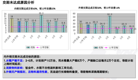 通過對配件車間內油壓機,火排沖壓設備,火排裝配線,水箱沖壓設備,小U開料設備,總裝車間備料區等設施進行重新規劃、調整,減少車間一次物流距離1500M,在制品面積下降63%,庫存金額下降50%。通過燃熱產品部物與情報現狀圖與理想圖對比,得出目前存在的問題并設置改善對策。